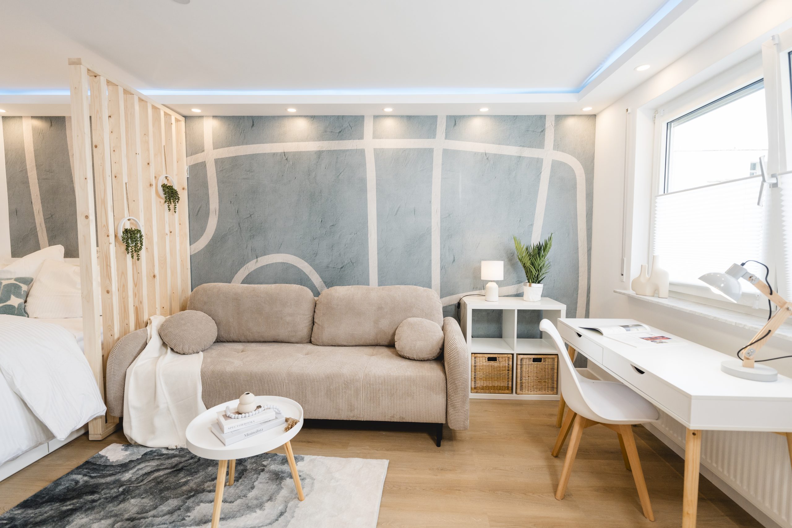 Im Fokus stand eine Einrichtung, die funktional, einladend und hochwertig wirkt. Durch multifunktionale Möbel, gut genutzten Stauraum, helle Farben und gezielt eingesetztes Licht entstand ein möbliertes Apartment, das offen, ruhig und gleichzeitig praktisch wirkt. Wohnen, Schlafen und Essen wurden auf kleiner Fläche sinnvoll miteinander verbunden, ohne dass der Raum überladen wirkt.